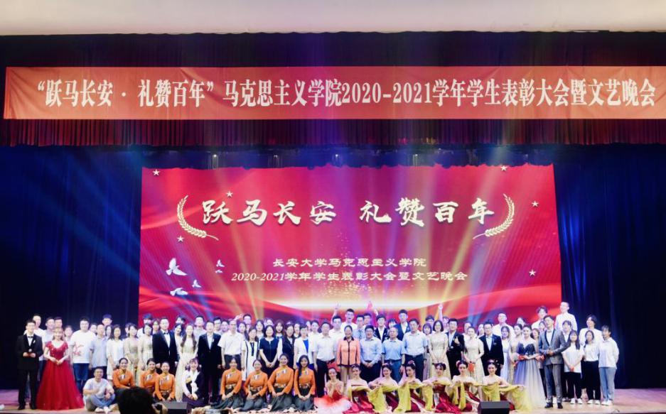 为庆祝中国共产党建党一百周年,深入开展党史学习教育,大力弘扬和培育广大师生的爱国主义精神。5月31日晚,马克思主义学院在长安文化艺术中心大礼堂举办“跃马长安·礼赞百年”2020-2021学年学生表彰大会暨文艺晚会。